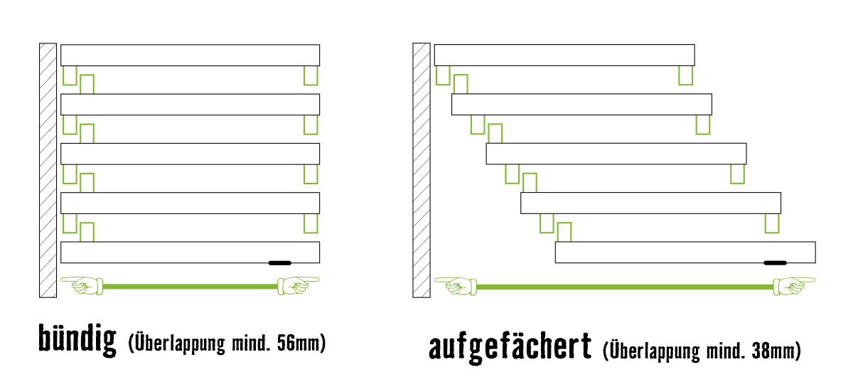 - Aufgefächert: Die Scheiben stehen leicht versetzt (bei 38–56 mm Überlappung).