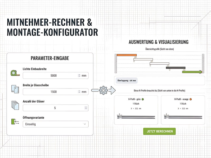 Gib einfach die Maße deiner Glasschiebewand (Einbaubreite, Glasbreite, Anzahl der Scheiben) und deine bestellten Optionen in die Felder oben ein. Unser Rechner kalkuliert sofort die optimalen Positionen für deine Mitnehmer und erstellt dir eine leicht verständliche Übersichtsgrafik.