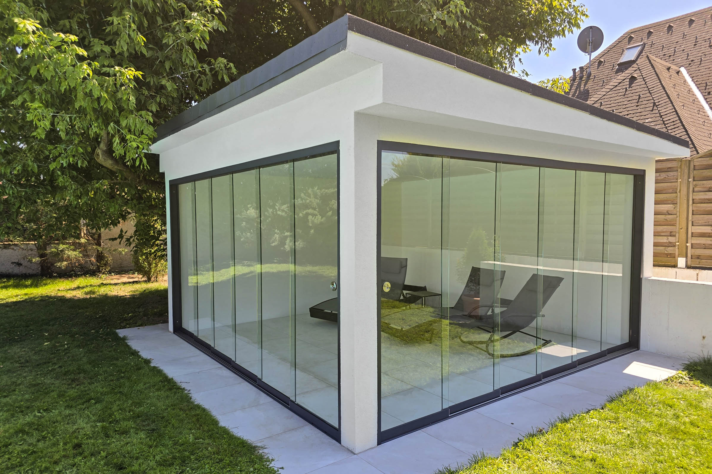Umbau eines Poolhauses zur wetterfesten Lounge mittels zwei 6-spuriger Deponti Fiano Glasschiebewände in RAL 7024 (Anthrazit), 10 mm ESG-Sicherheitsglas (EN 12150).