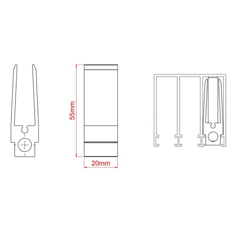 - Schutz davor, dass Glasscheiben über das Ende der Führungsschiene hinausfahren, falls kein Wandanschlag vorhanden ist.
